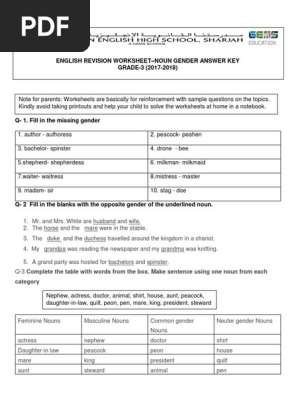 Displaying 8 worksheets for gender noun for grade 4. Gender worksheets and online activities. Free esl printable grammar and vocabulary worksheets, english exercises, eal handouts, esol quizzes, efl activities, tefl questions, tesol materials, english teaching and learning resources, fun crossword and word search puzzles, tests, picture dictionaries, classroom posters. Documents similar to noun gender revision worksheet answer key.